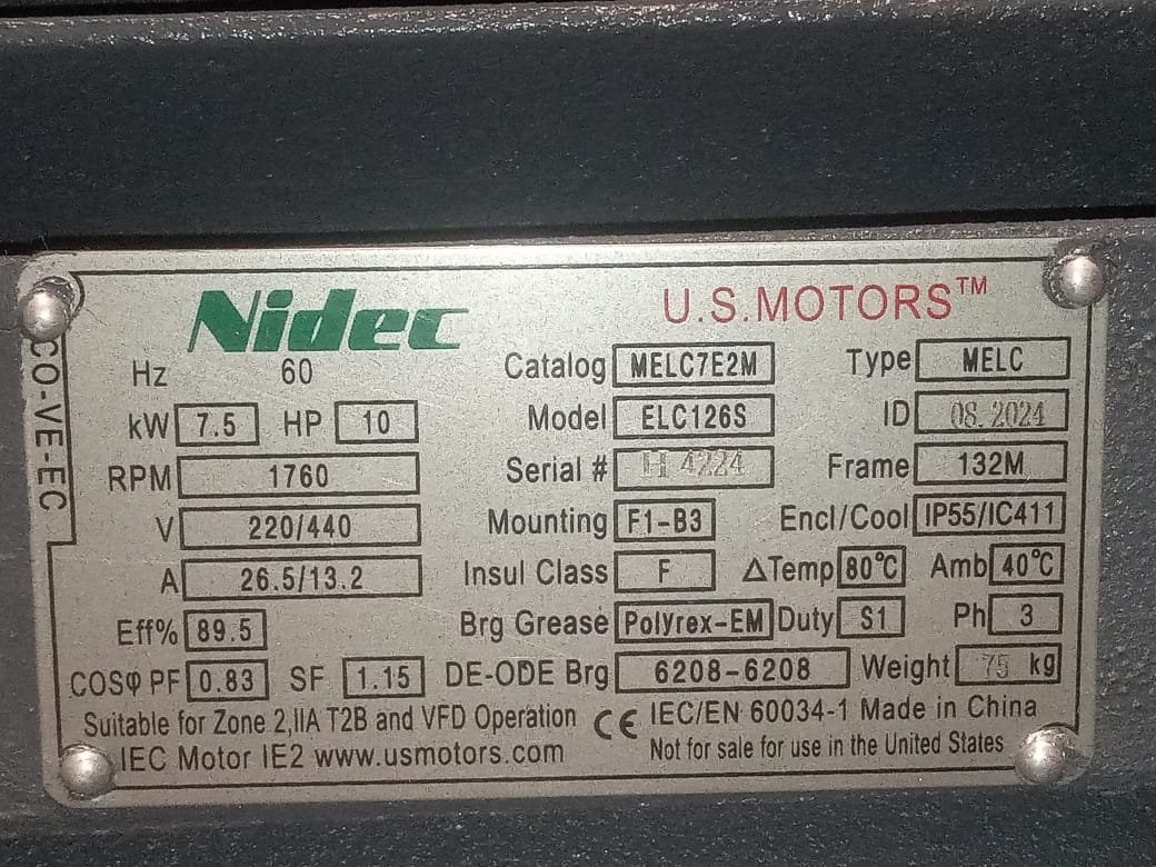 MOTOR HORIZONTAL 10,00HP 1800RPM US MOTORS MELC7E2M / ELC126S 3PH 220-440V 4P SF 1,15 9W DOL 132M TEFC IEC-IE2 CI