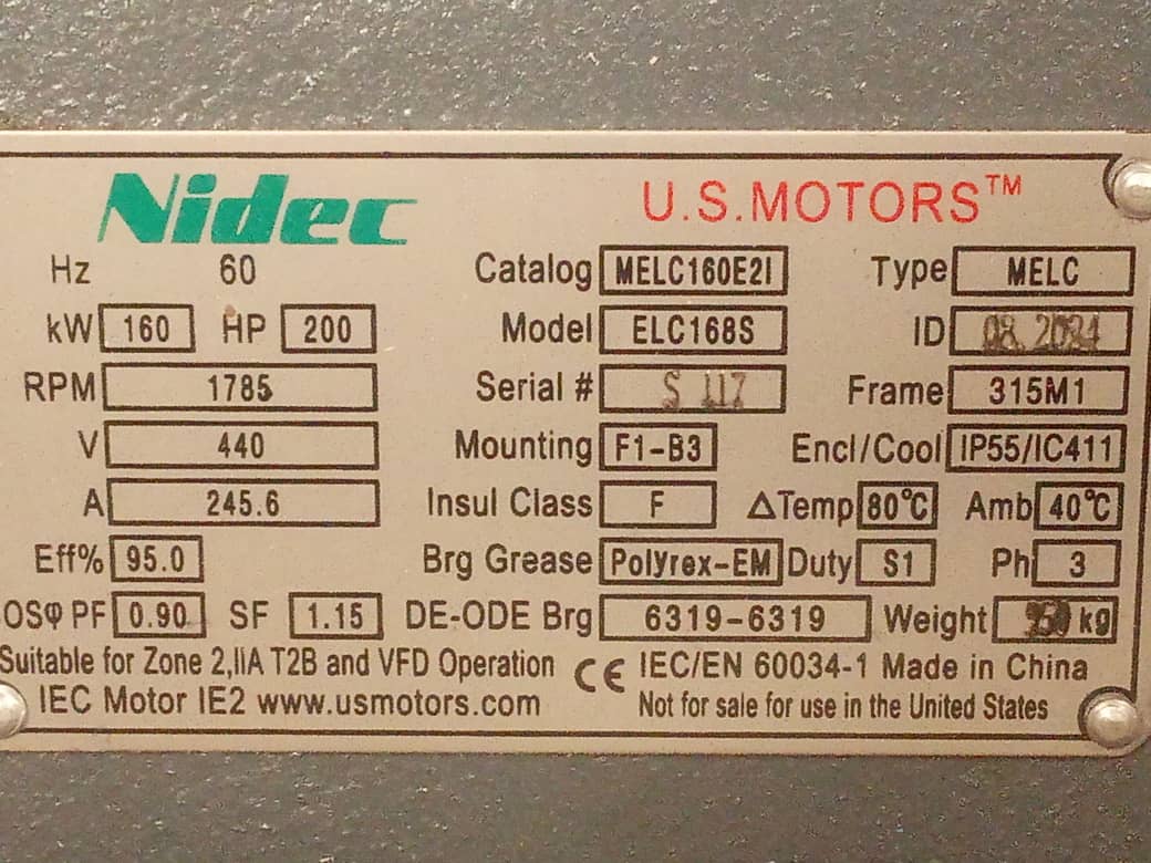 MOTOR HORIZONTAL 200,00HP 1800RPM US MOTORS MELC160E2I / ELC168S 3PH 220-440V 4P SF 1,15 9W DOL 315M1 TEFC IEC-IE2 CI