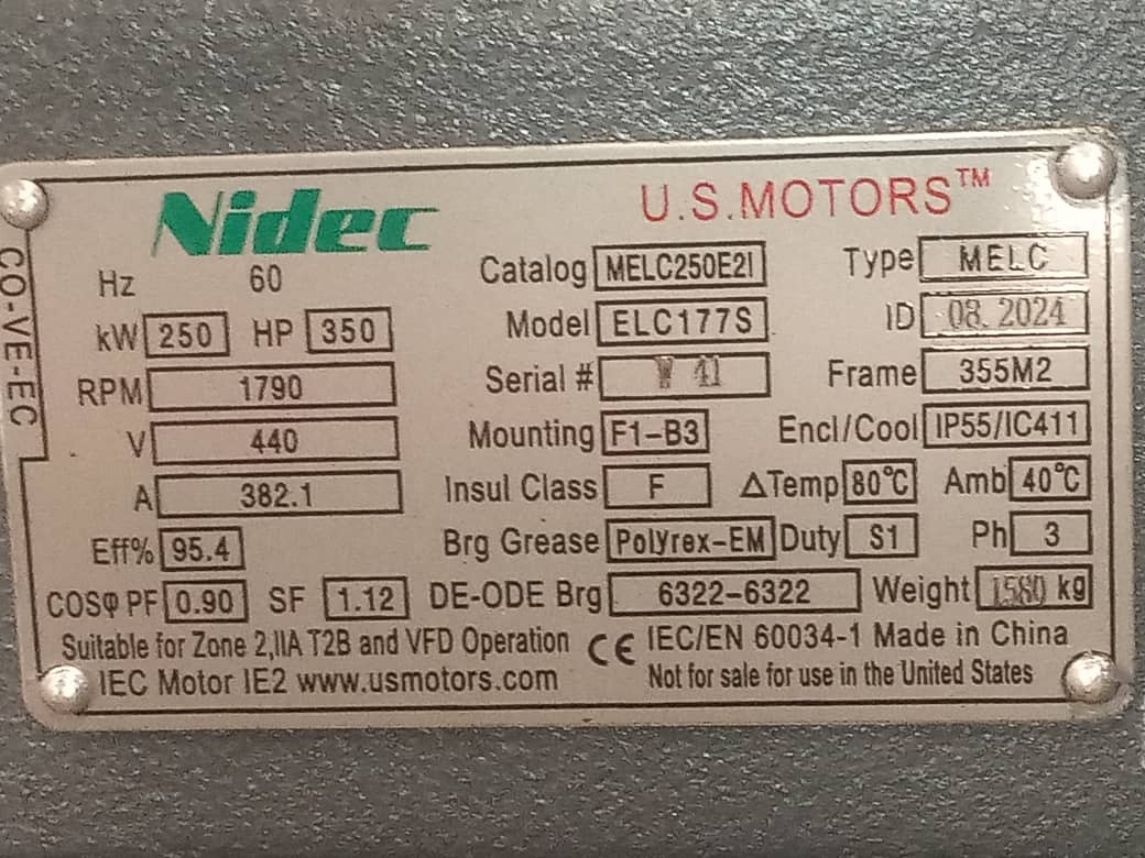 MOTOR HORIZONTAL 350,00HP 1800RPM US MOTORS MELC250E2I / ELC177S 3PH 440V 4P SF 1,15 9W DOL 355M2 TEFC IEC-IE2 CI