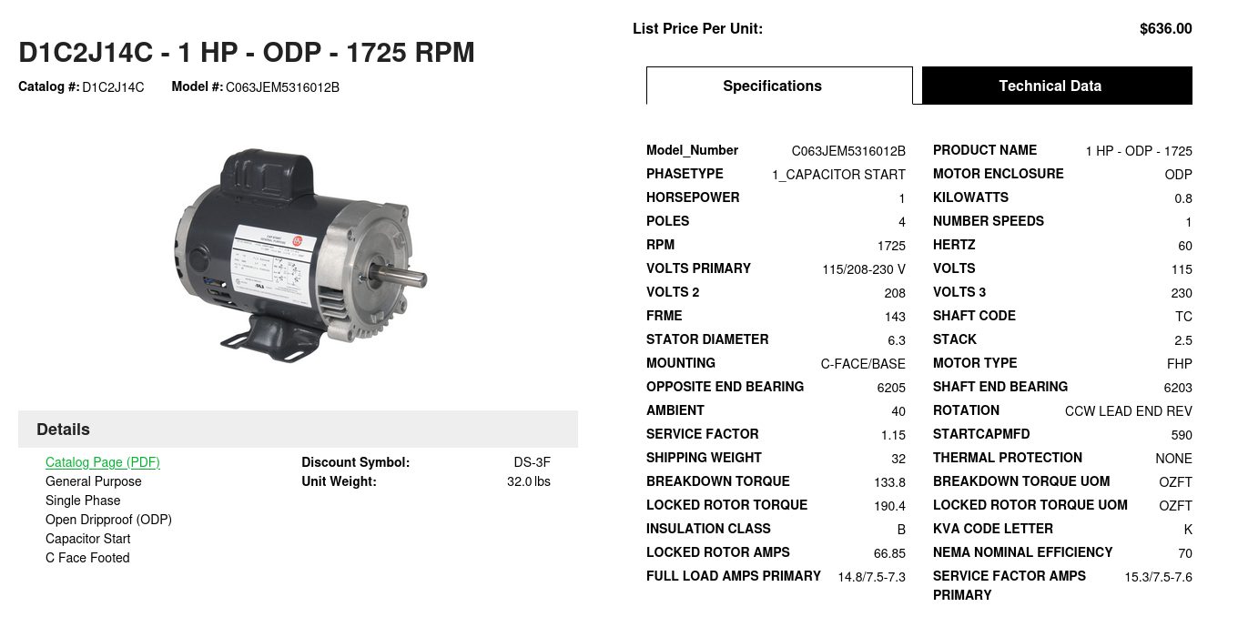 MOTOR HORIZONTAL TC 1,00HP 1800RPM US MOTORS D1C2J14C 1PH 115/208-230V 4P SF 1,15 3W DOL 143TC ODP NEMA CI