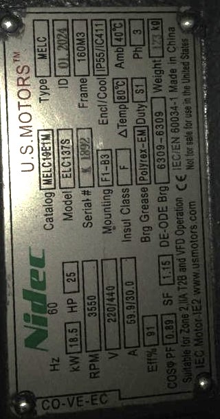 MOTOR HORIZONTAL 25,00HP 3600RPM US MOTORS MELC19E1M / ELC137S 3PH 220-440V 2P SF 1,15 9W DOL 160M3 TEFC IEC-IE2 CI